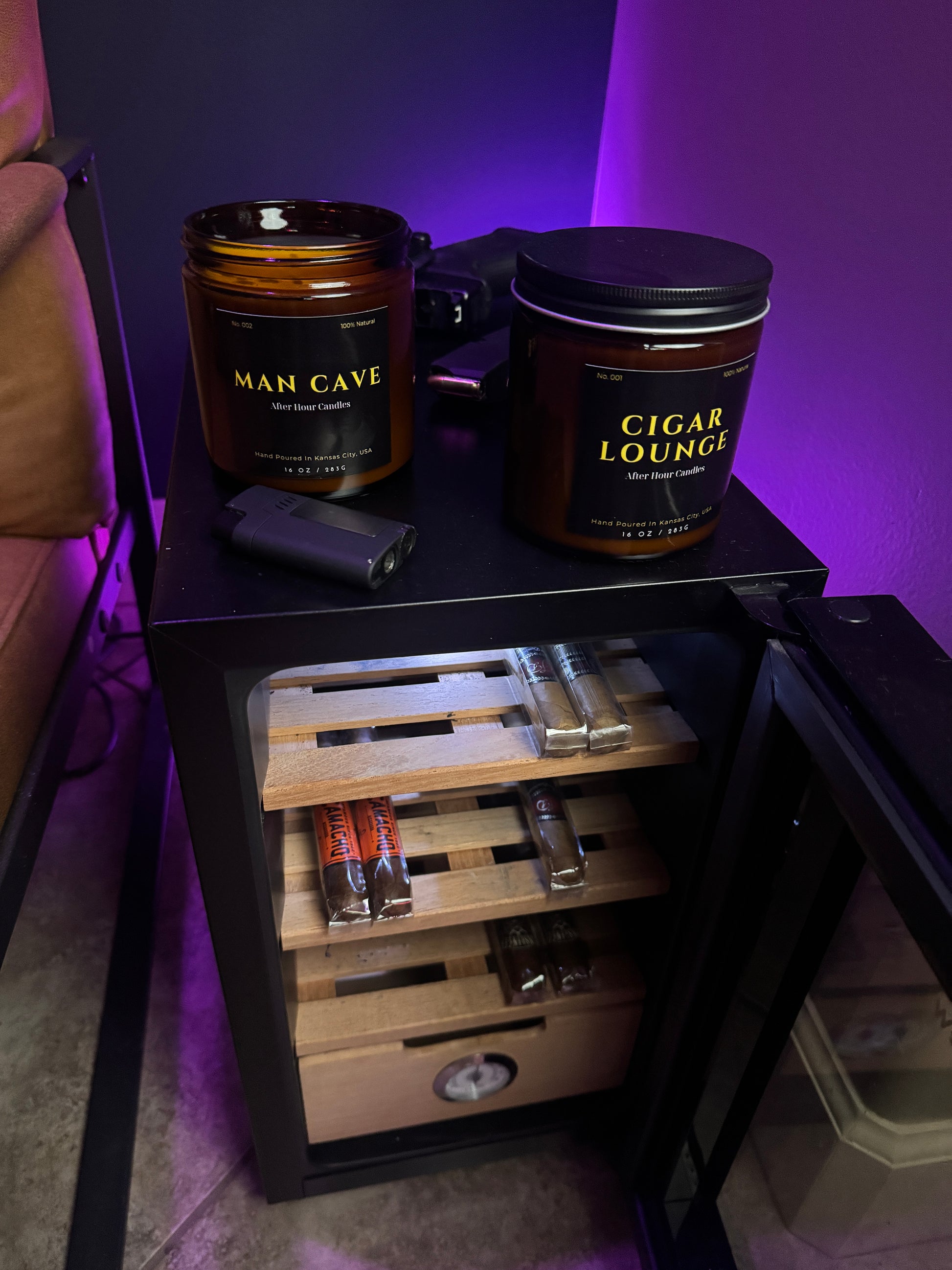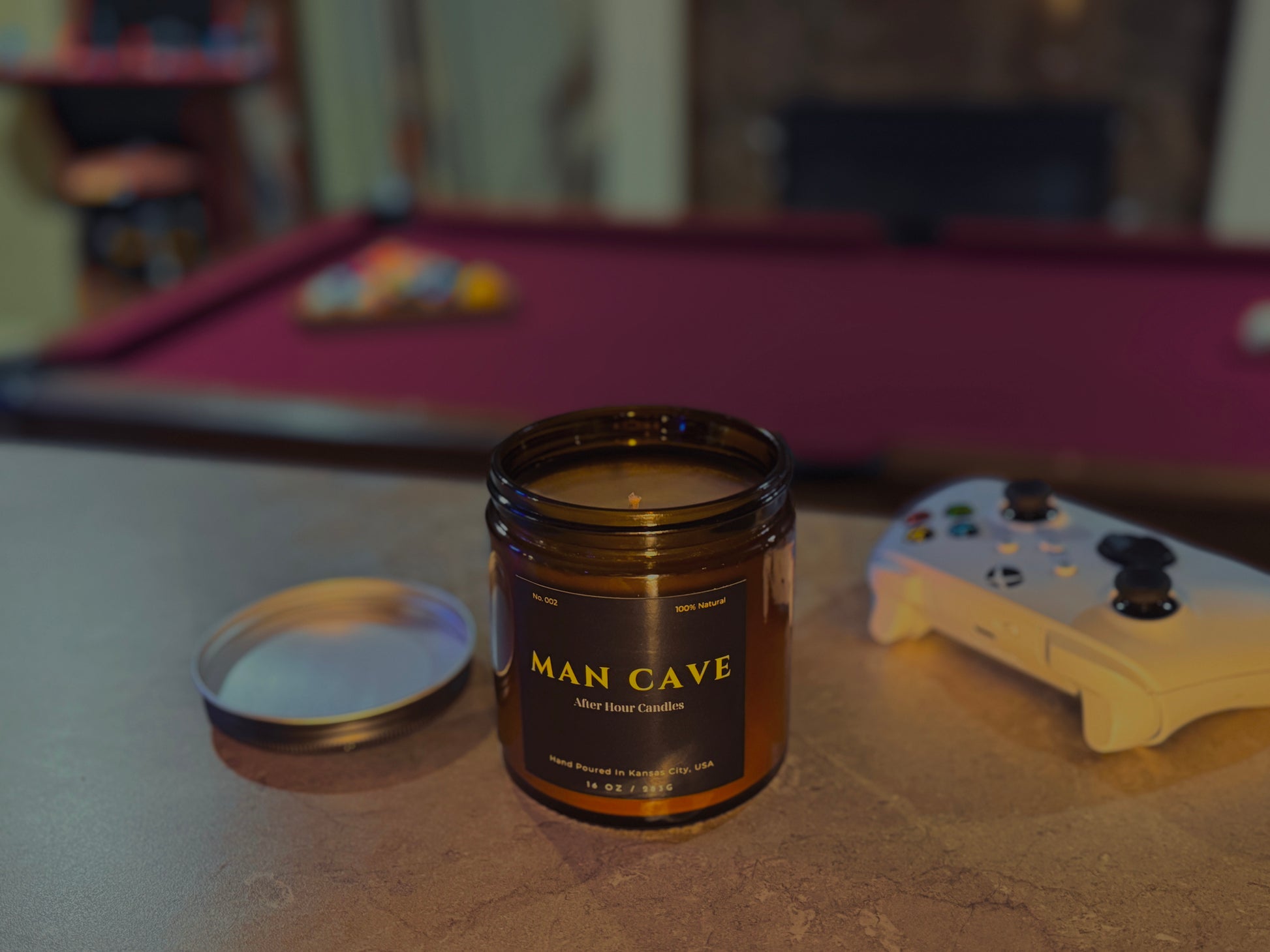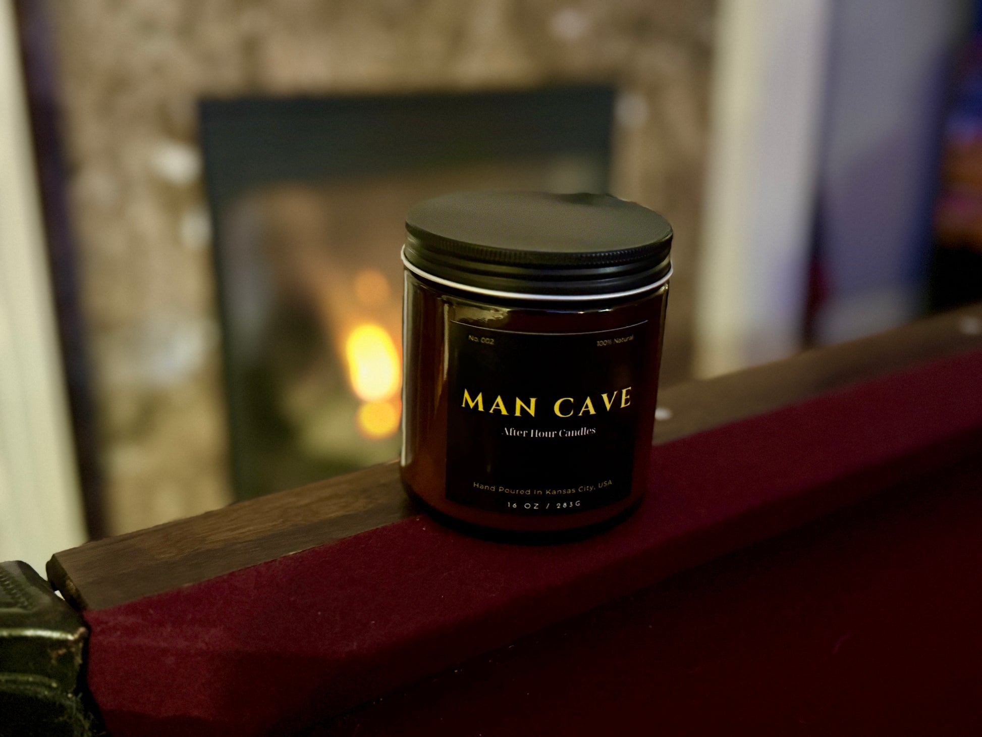 16 .oz luxury candle with a fragrance that resembles a man cave vibe